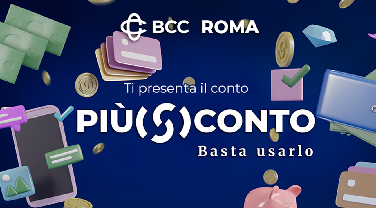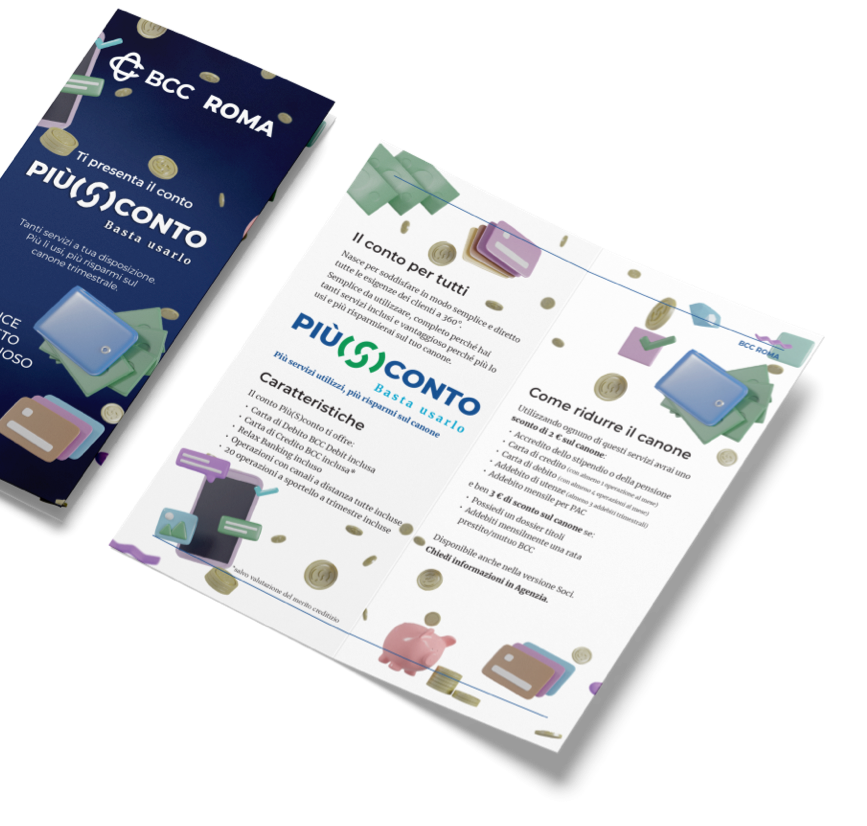 È stato sviluppato il naming del conto, il suo payoff, il concept di campagna e la creatività declinandola su diversi media: locandina, leaflet, banner Home Page BCC Roma, banner ATM BCC Roma, banner Internet BCC Roma, banner Intranet BCC Roma e Totem Agenzie BCC Roma.